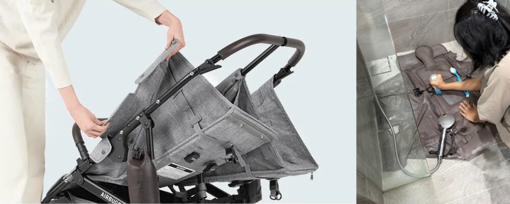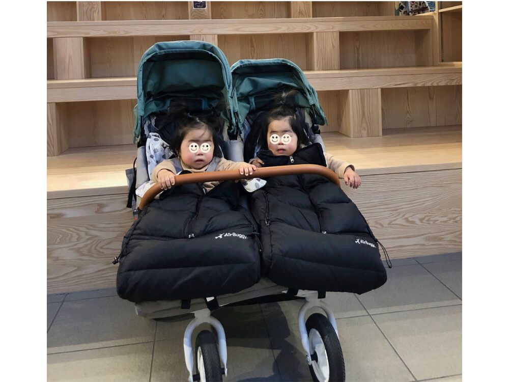 双子用ベビーカーはどうしても大型になりがちですが、エアバギーのフォルムやカラーは街中でも映えます。