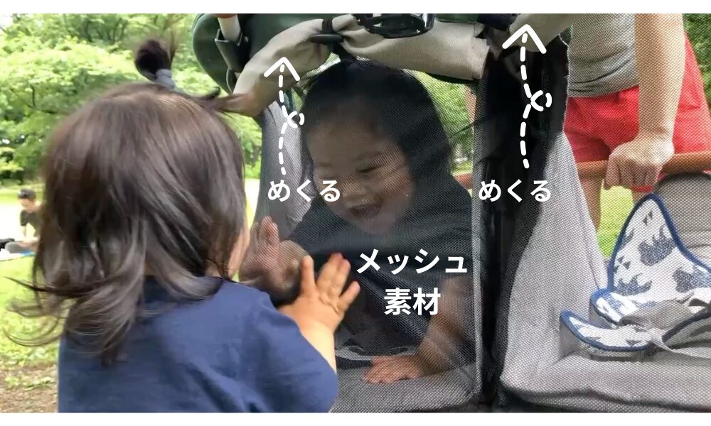 さらにサンシェード(キャノピー)は大きく、ほぼ全体を覆えるほどのサイズ感。個室のような空間が生まれるので、強い日差しはもちろん、人目が多い場所でのお昼寝にも大活躍。視線よけにもなるので子どもが安心して眠れます。