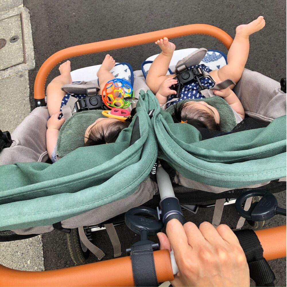 双子ベビーカーがあると、外出のハードルがぐっと下がります。我が家はエアバギーココダブルを愛用中。段差もスイスイ、操作しやすくてお気に入り。