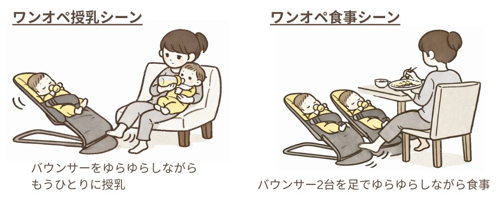 - 足でバウンサー2台を揺らしながら、自分の支度や食事ができる